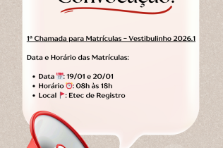 ETEC de Registro convoca para matrícula os aprovados no vestibulinho 2026.1 – 2ª chamada