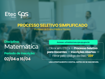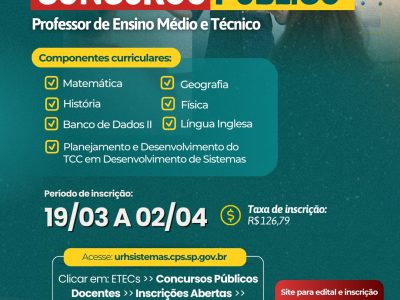 A Etec de Registro comunica a abertura de Concurso Público para a contratação de docentes para o Ensino Médio e Técnico, com período de inscrições de 19 de março até às 23h59 de 02 de […]