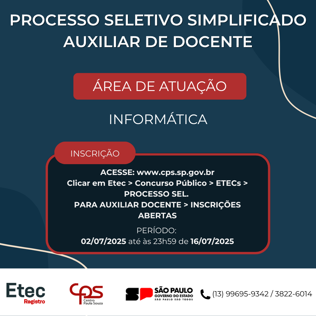 A ETEC de Registro comunica a abertura de um Processo Seletivo Simplificado para a contratação de Auxiliar de Docente na área de informática, com período de inscrições de 02 de julho até às 23h59 de 16 de julho de 2025.