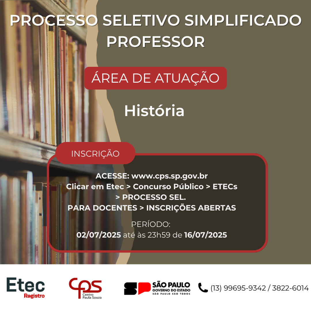 A ETEC de Registro comunica a abertura de um Processo Seletivo Simplificado para a contratação de Docente, com período de inscrições de 02 de julho até às 23h59 de 16 de julho de 2025.