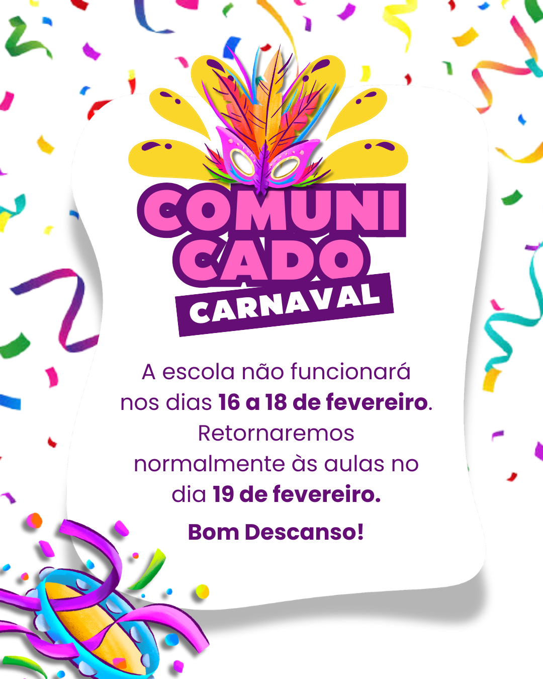 Comunicamos, que a escola não funcionará no período do Carnaval – 16.02 e 17.02 e na 4ª feira de Cinzas – 18.02.2026.