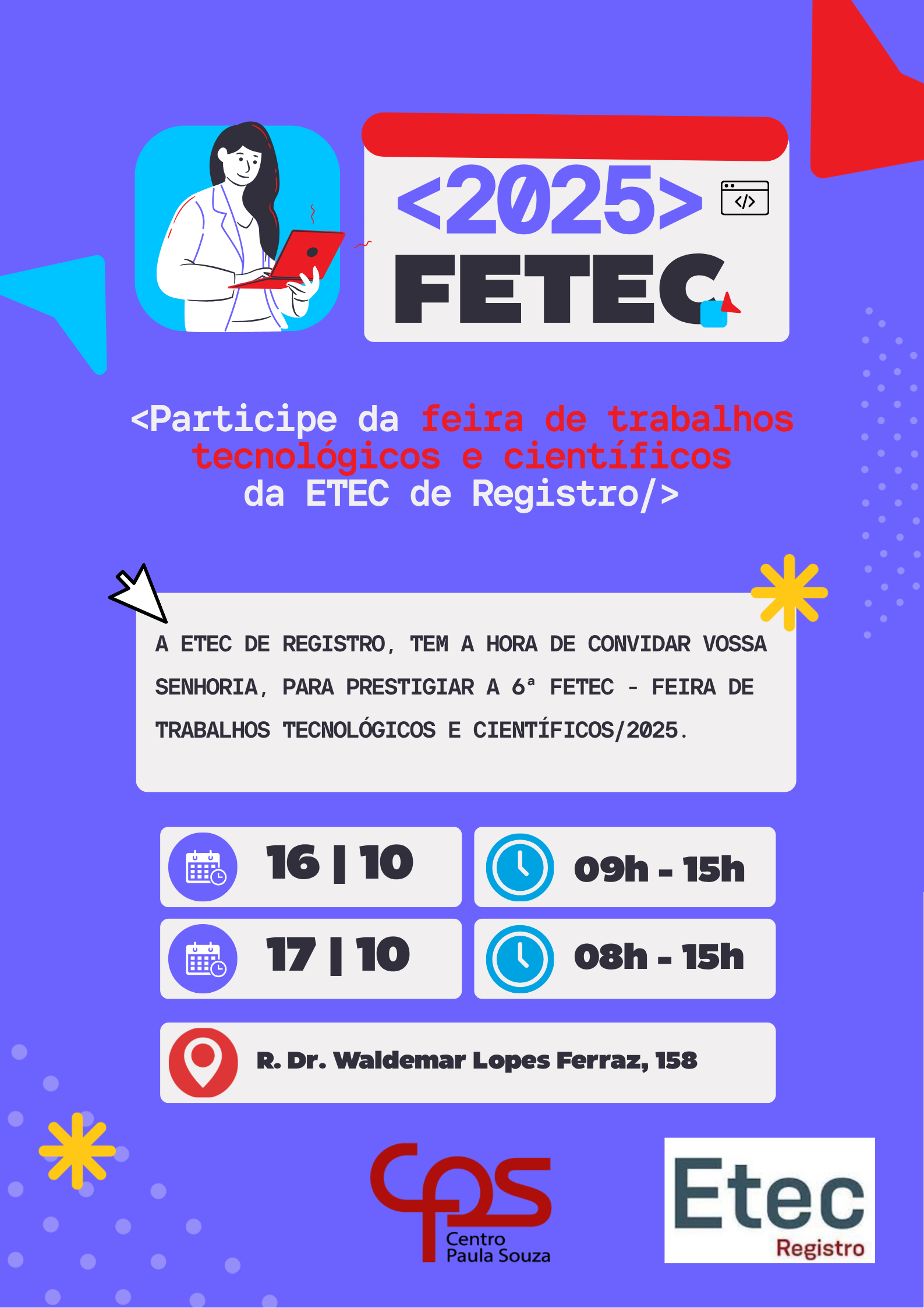 A 6ª FETEC de Registro acontece nos dias 16 e 17 de outubro de 2025, das 9h às 15h, na ETEC de Registro. O evento contará com projetos inovadores, atividades interativas e sorteio de prêmios.
