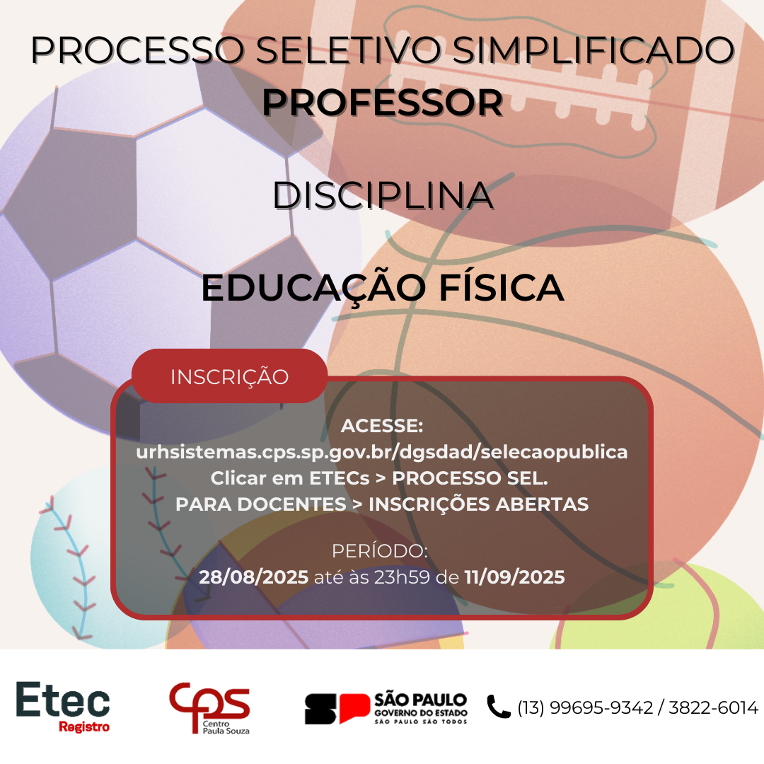 A ETEC de Registro comunica a abertura de um Processo Seletivo Simplificado para a contratação de Docente, com período de inscrições de 28 de agosto até às 23h59 de 11 de setembro de 2025.