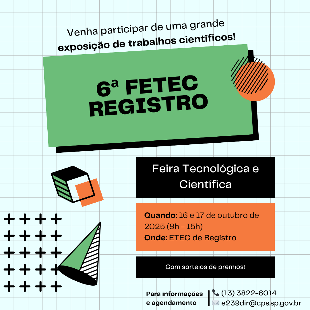 A 6ª FETEC de Registro acontece nos dias 16 e 17 de outubro de 2025, das 9h às 15h, na ETEC de Registro. O evento contará com projetos inovadores, atividades interativas e sorteio de prêmios.